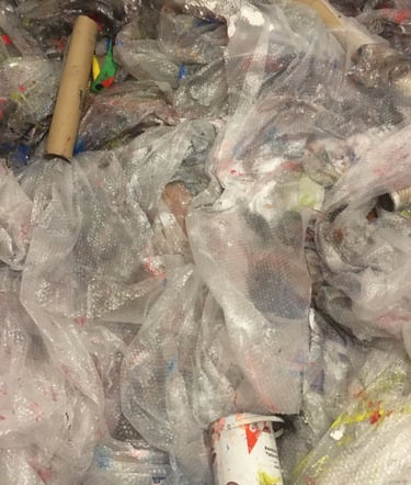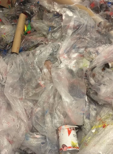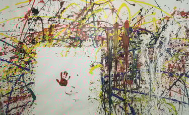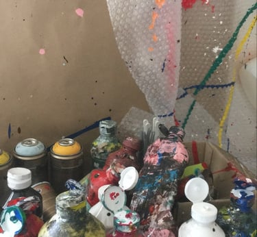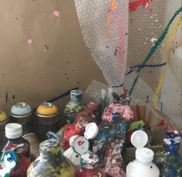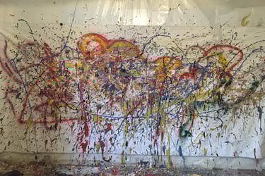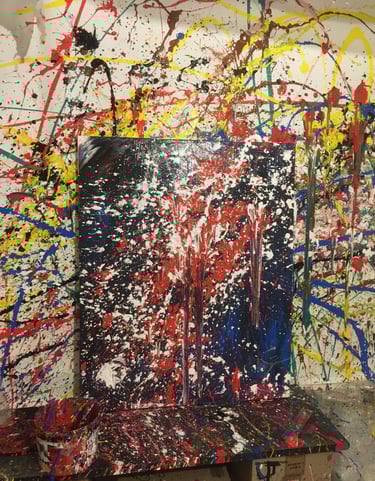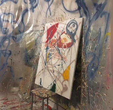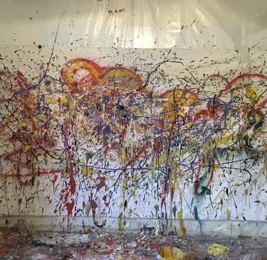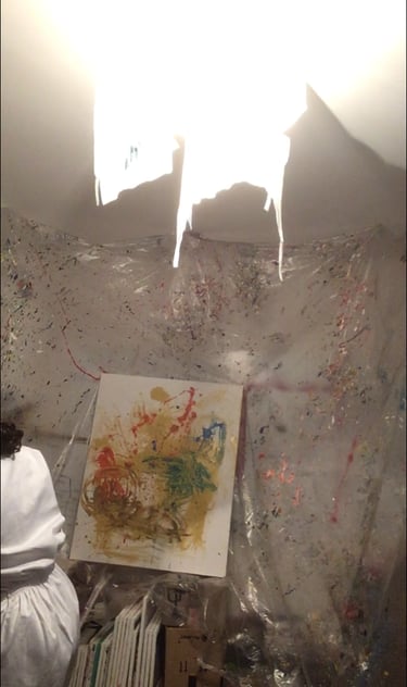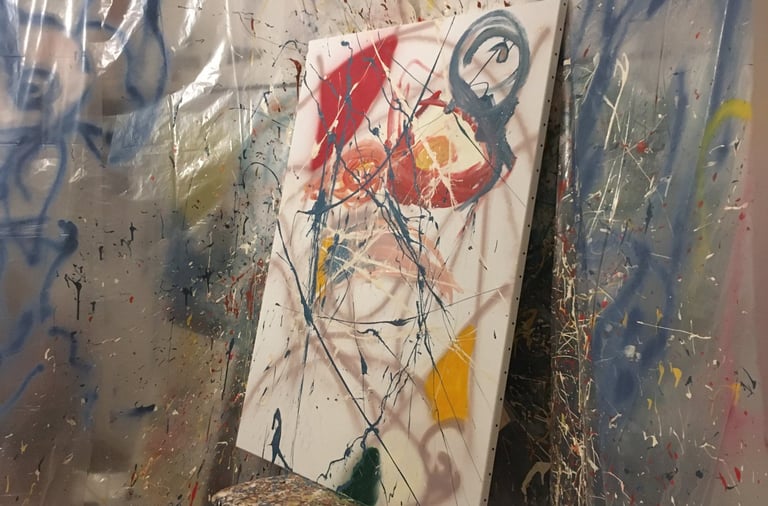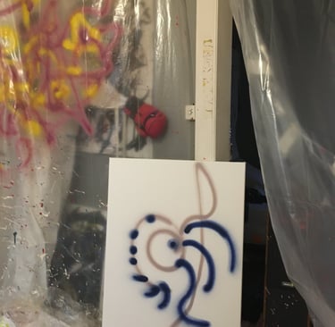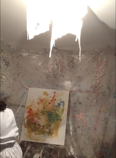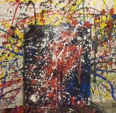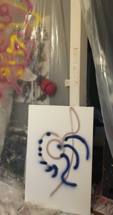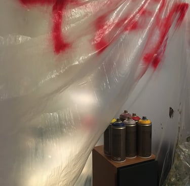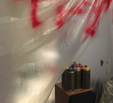 Ce soir là, l'envie me pris de répéter un procédé précédement utlisé. Le procédé était le suivant : recouvrir de film plastique une partie de la toile pour en preserver les sous couches lors de la projection de peinture. Le resultat fut tellement interessant que la toile fut laissé telle quelle et celle-ci fut un nouvel essai.