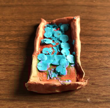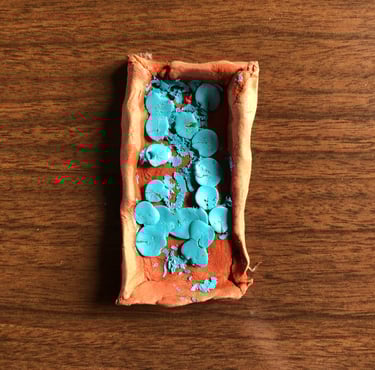 Création d'un socle rectangulairerempli de colle transparante.Ajout de pastel grasse bleue fondue.
