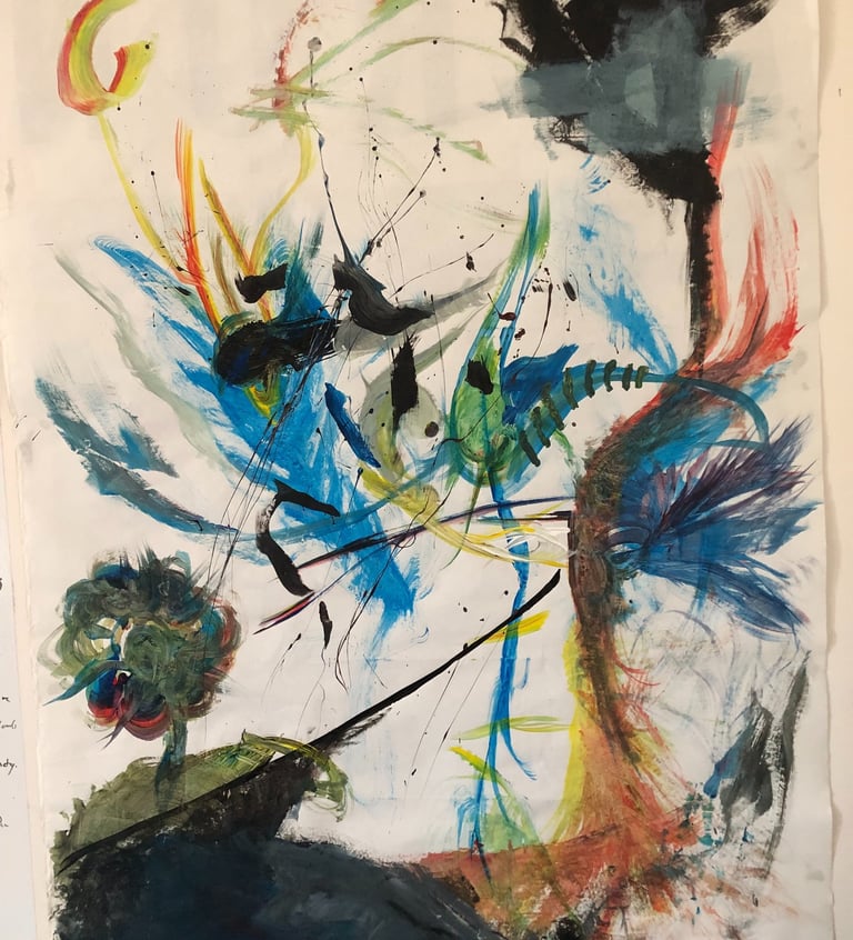 Ele est née d'une experimentation des couleurs primaires et de differents matériaux pour seconder un pinceau classique.